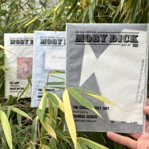 SB/JZ: Moby Dick Filet is our longest-running and most exciting publishing experiment. We fillet the famous novel on Captain Ahab’s hunt for the white whale into its 136 chapters and publish them as a form of dime novel, but not chronologically. The artists that we invite select a chapter that they then design. The only premise is that the text by Herman Melville appears in some form or other and remains readable. For us, it’s a great way to be able to work together with a great variety of artists. Through this, a connection is also created among the artists — that’s the idea of the artist groups, again, that in fact runs through everything we do.